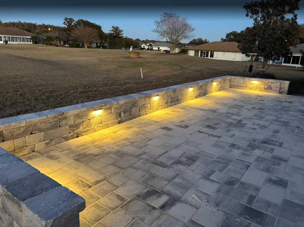 This project features a patio wall surround built with Stonegate White/Pewter wall block, creating a clean and modern aesthetic that complements the outdoor space. Undercap lighting was incorporated throughout, providing subtle illumination and highlighting the wall’s design for evening enjoyment.
