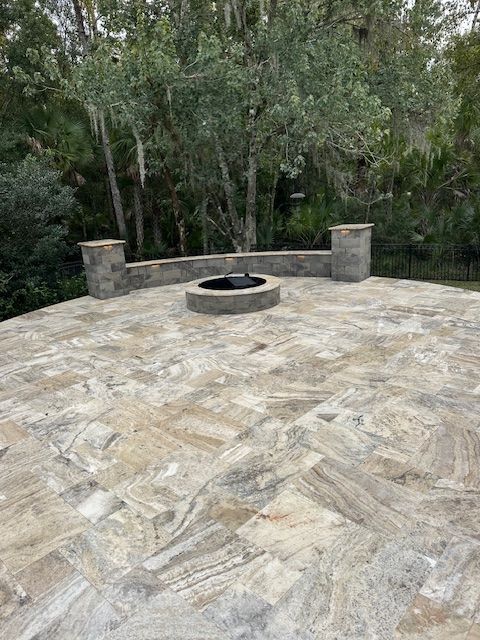 This project features a stunning patio installed with Alaskan Silver Travertine in a French pattern, creating an elegant and timeless outdoor space. To enhance both functionality and style, we incorporated a coordinating sitting wall and fire pit, each topped with matching travertine for a cohesive, polished look.