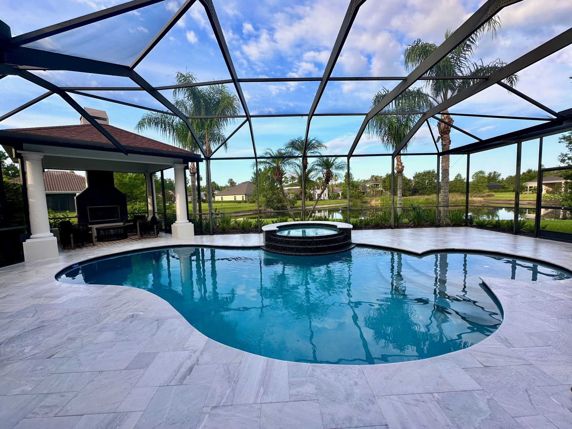 This project features a luxurious pool deck and spa surround installed using Ice White Marble in a French pattern. The crisp, elegant marble creates a bright, timeless look while providing a durable and slip-resistant surface around the pool and spa areas.